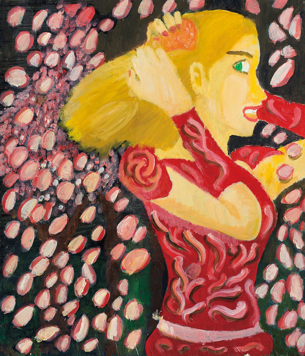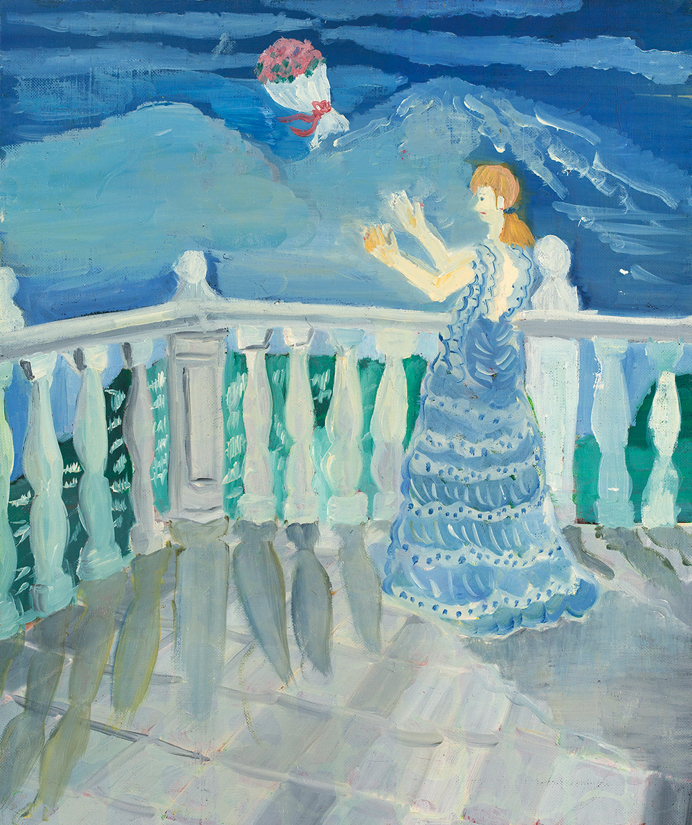 構図のバランスは見事であり、人物の腕が示す斜めの線が鑑賞者の視線を宙に舞う花束へと誘導する。それは、まるで現実と空想のはざまに浮かんでいるかのようだ。また、暖色である花のピンクと背景の青やグレーのコントラストが、劇的でロマンチックな感覚を際立たせている。主人公の解放の象徴である花束に立体感を与えているのは、重厚な油絵具の密度。憂いを帯びた人物の表情は、この解放がはかないものであることを示唆している。
