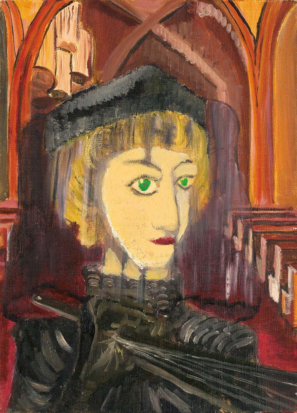 この肖像画は、葬儀の最中に怒りを隠そうと努める若い女性に焦点を当てた油彩画である。やや直線的に描かれた口元はかろうじて隠すことのできた緊張を暗示し、扇子を握る指には明白なまでに感情の抑制が表現されている。