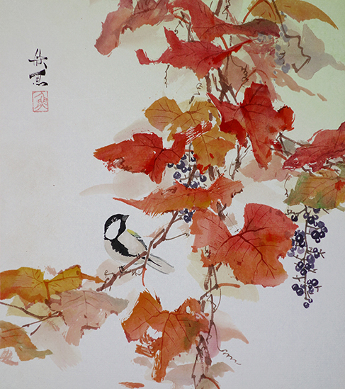 《山葡萄》 2020年 水干絵具、墨/画仙紙(色紙) 27.3×24.2cm