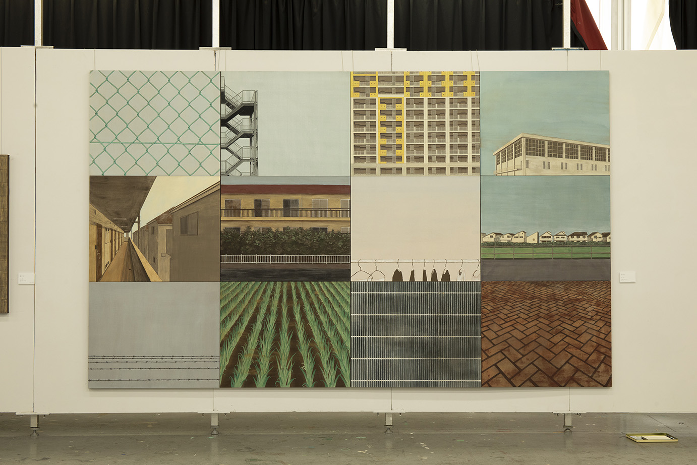 彫刻学科 石﨑朝子 (左より)《Layered city》 アルミ板、ウレタン塗料、モルタル、蝶番 H1040×W2100×D800mm 《City development map》 アルミ板、ウレタン塗料、蝶番 サイズ可変 《Following Sky》 映像/液晶ディスプレイ 20分26秒 《City Wall》 木材、モルタル、アクリル塗料 H1800×W3200×D1000mm