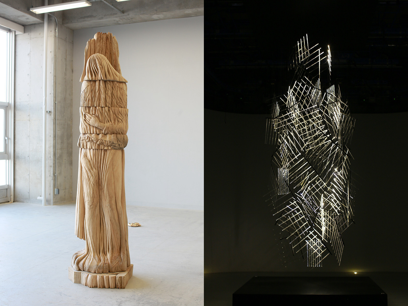 左/彫刻学科 黒瀧舞衣 《衣に依る》 木彫、寄木造り:樟 H2650×W750×D750mm
