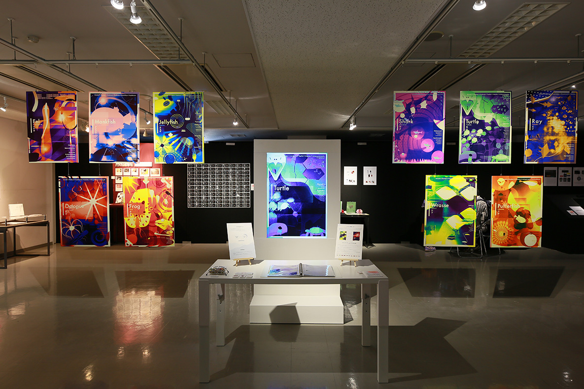 デザイン情報学科 岸杏樹 《ecolomotion ―水生生物の生態を活かしたモーションポスター作品―》 映像/液晶ディスプレイ、パネル、本 2分30秒、H515×W364mm×10点、H364×W257mm(80ページ)