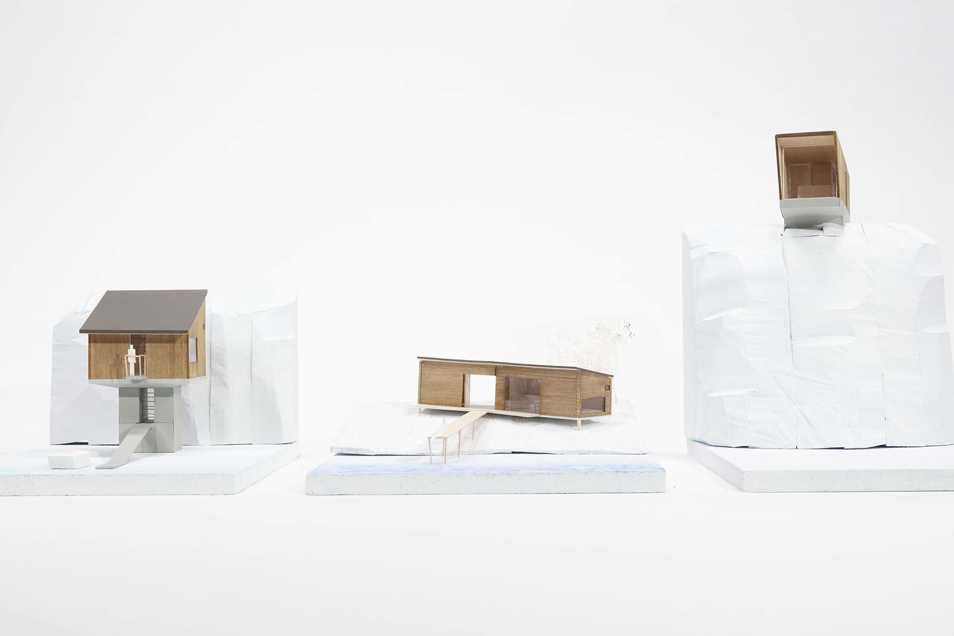 環境デザイン学科 河内実紀 《海をキリとる小屋》 図面、模型、スケッチ:スチレンボード、スタイロフォーム、画材 D600×W300×H400mm(3点)