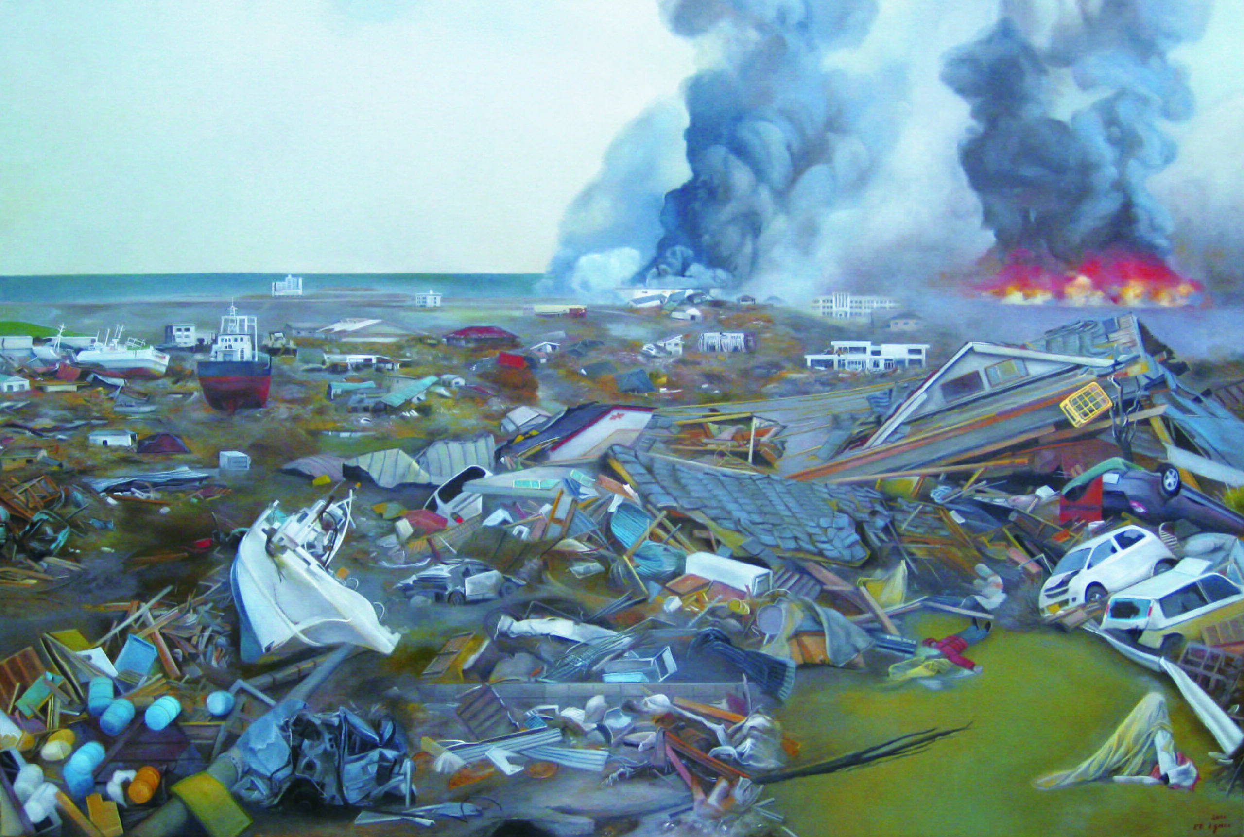 2011年3月11日、東北地方を中心とする日本に多大な被害をもたらした大震災をテーマにしたこの油彩画は、劇的な瞬間を切り取った写真のような絵画といえる。震災にまつわる痛みを訴える叫びであると同時に、犠牲者への鎮魂や敬意の表れなのであろう。もしかすると、復興に向けて新たな一歩を踏み出した人々に対する賛辞も込められているのかもしれない。