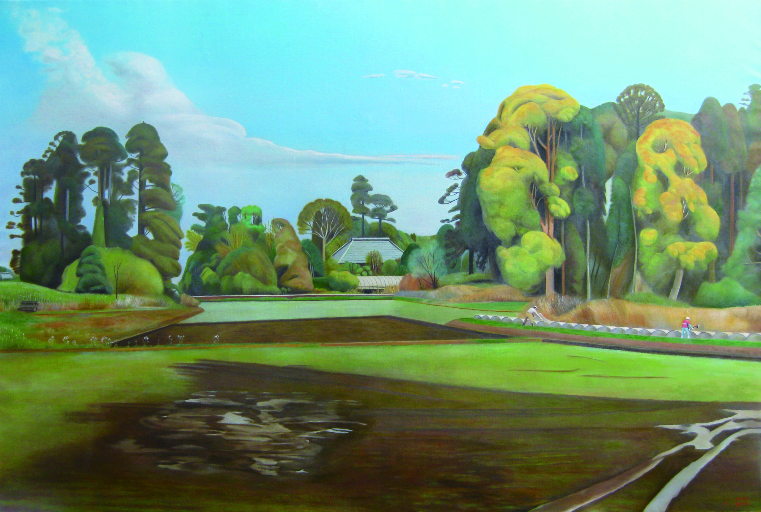 描かれているのは、画家が住む千葉市に近い、同じ千葉県にある茂原市の風景。光に対する繊細な感覚により、画面の細部に至るまで緑豊かな自然の雰囲気が伝えられている。