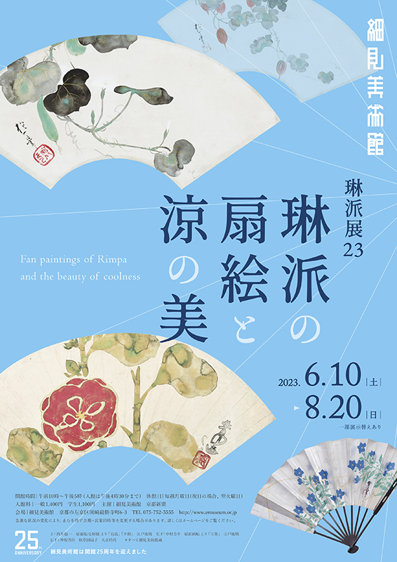 琳派展の第23弾となる本展では、細⾒美術館のコレクションを中⼼に、扇絵や団扇絵、夏秋の草花図などを通じて涼を感じさせる美術品が展覧される。