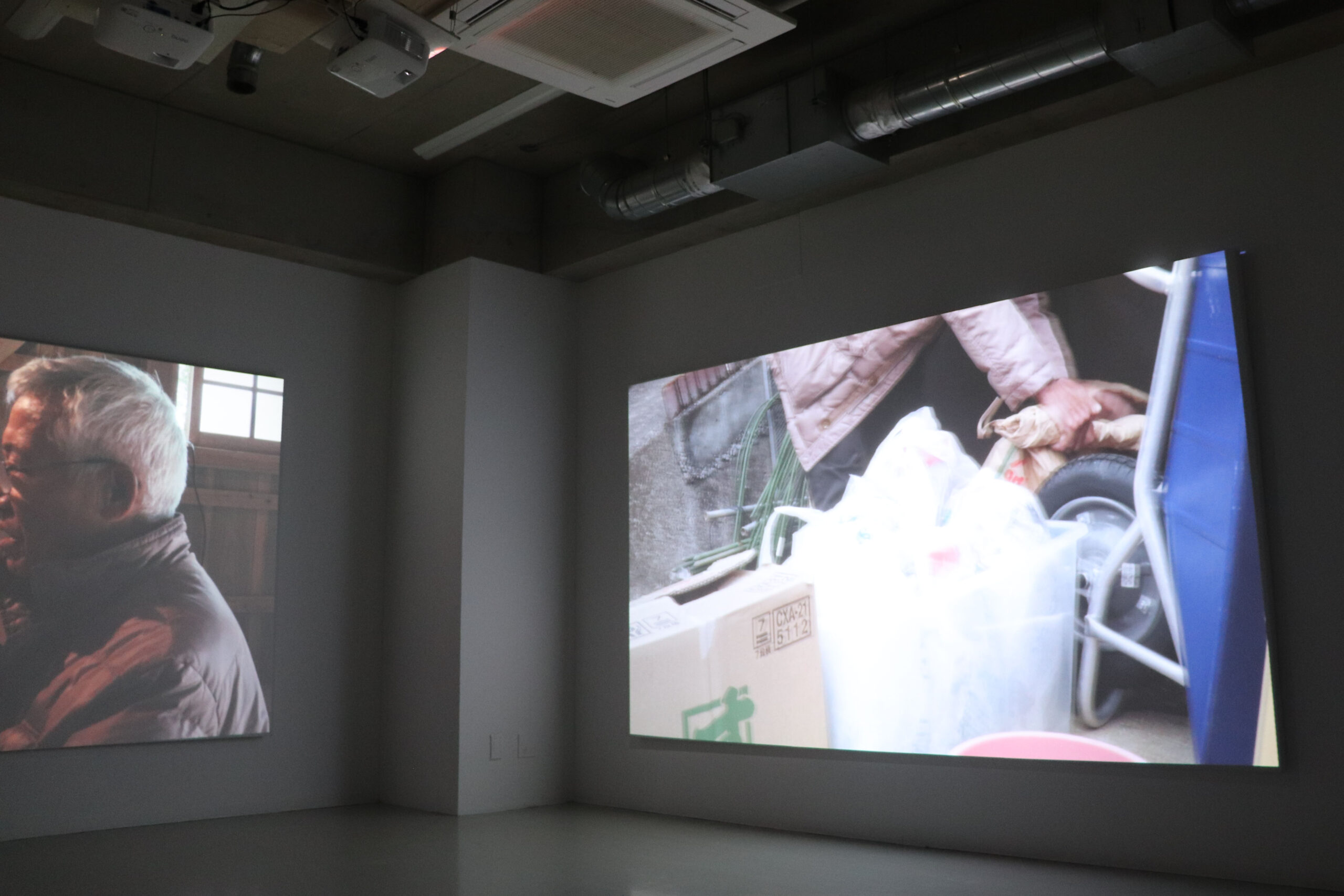 ──服部さんがとても丁寧にこのテーマを扱っていることが分かりました。今回は2つのスクリーンと1台のモニターによる、計3つの映像によって構成されていますが、この展示方法にはどういった意図があるのでしょうか?