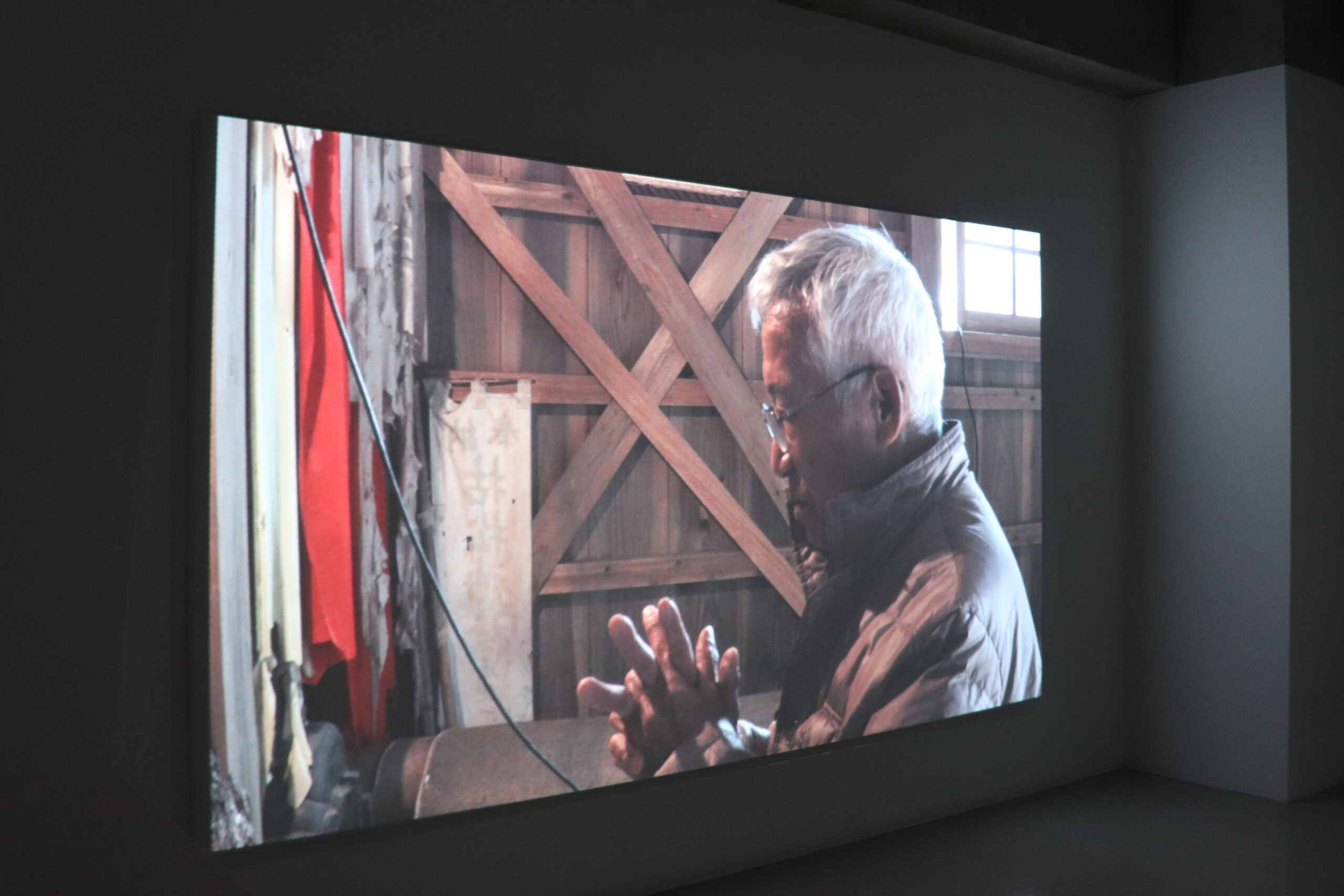 服部:モニターに映っている岩の映像が「形のある信仰の痕跡」。壁に投影されている映像のうち、お祈りを唱えているものが「過去から現在まで伝わってきた形のない痕跡」。痕跡って言っていいのかわからないけど。そして、その隣の映像が「現在のかくれキリシタンの日常」として、3つの映像を流しています。