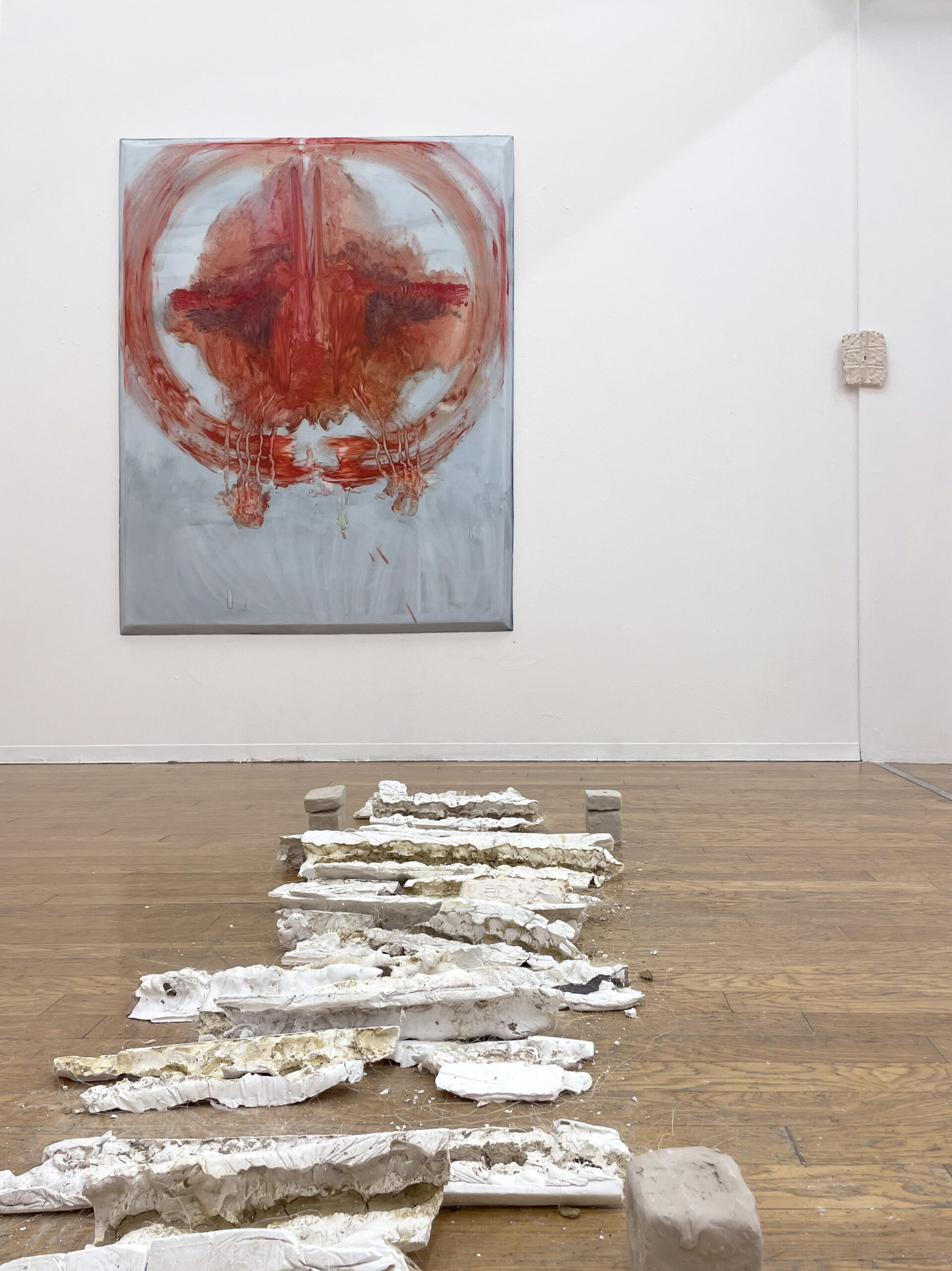 油絵を専攻する大上巧真の『rub rub rub area area area』は、自身の身体感覚についての認識を作品化したものだ。ここには、パネルに油絵具で描いた作品と樹脂を使ったレリーフ状の作品という2種類の平面、さらに石膏で作られた立体の3つの要素が入り込んでいる。油彩画は、道具を使わずに自らの身体で描いたという。