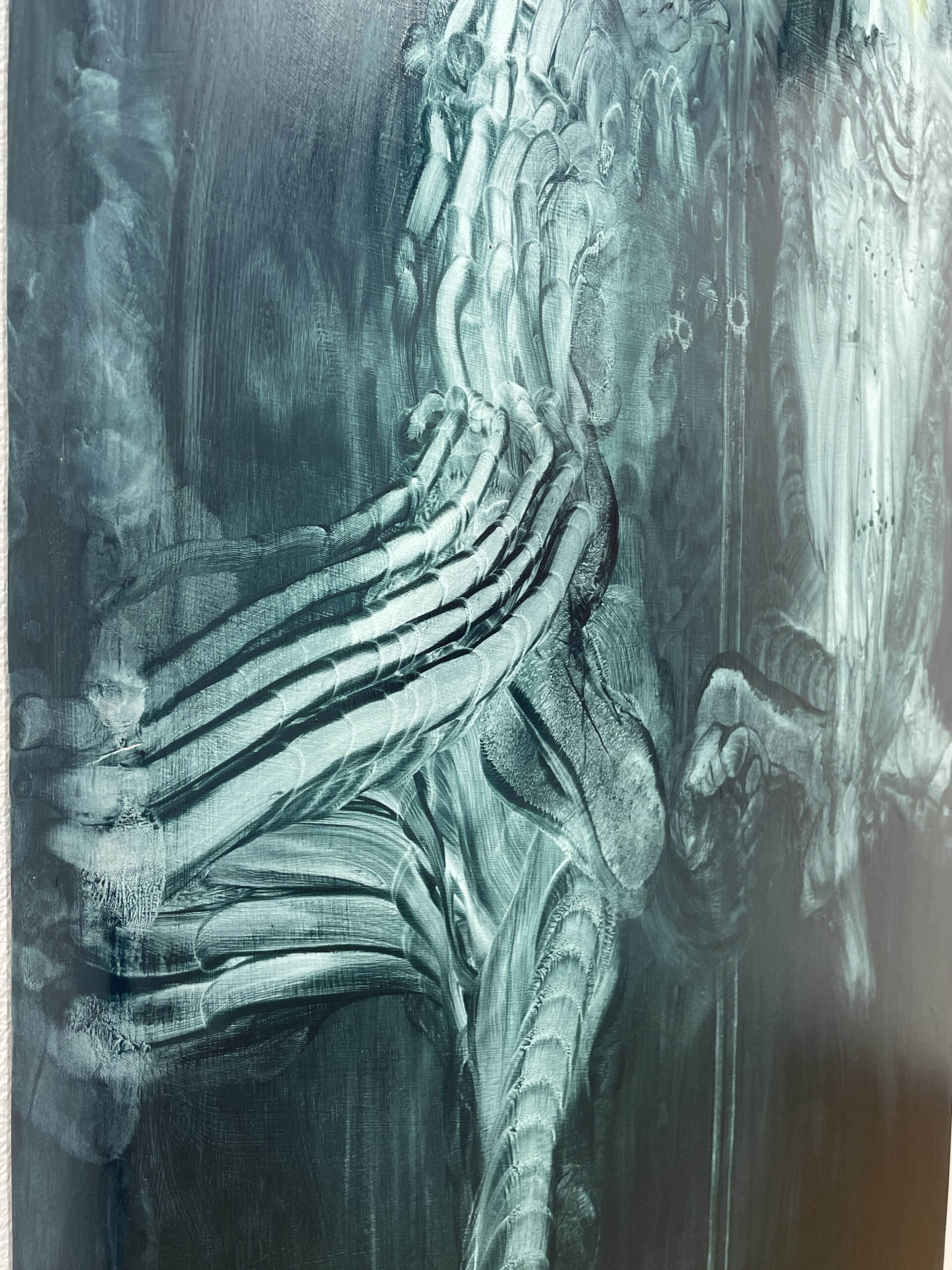 石膏や樹脂に対しては、絵具とはまた違う方法で新しい器官を作っているみたいな感覚です。立体作品は、粘土を口で噛んだものに石膏を流して型を取っていて、何となく背中や身体全体のイメージがあります。樹脂の作品は手や足の甲みたいな感覚です。いつもは手の存在を意識してないけど、手に絵を描くことでその存在を認識するみたいな。樹脂に対してはそう考えてます。