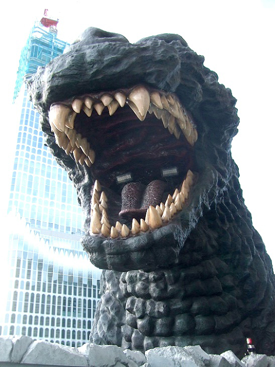 それにしてもテラスに出た人々は、いきなり怪獣が口を全開にして咆哮している、すぐ脇に立たされることになる。その迫力たるや半端でない。一瞬にして5人くらい呑みこまれてもおかしくない、凍りつくように凶暴な表情だ。通行人の手からはアイスクリームがポロリと床に落ち、辺りには女性の切り裂くような悲鳴が轟きかねない。スケール感でいえば多分ヒッチコック監督の『鳥』を超え、『ジュラシック・パーク』のティラノサウルスが人間たちの臭いを嗅ぎつけようと、地上に頭を寄せてくるシーンに優るとも劣らないだろう。